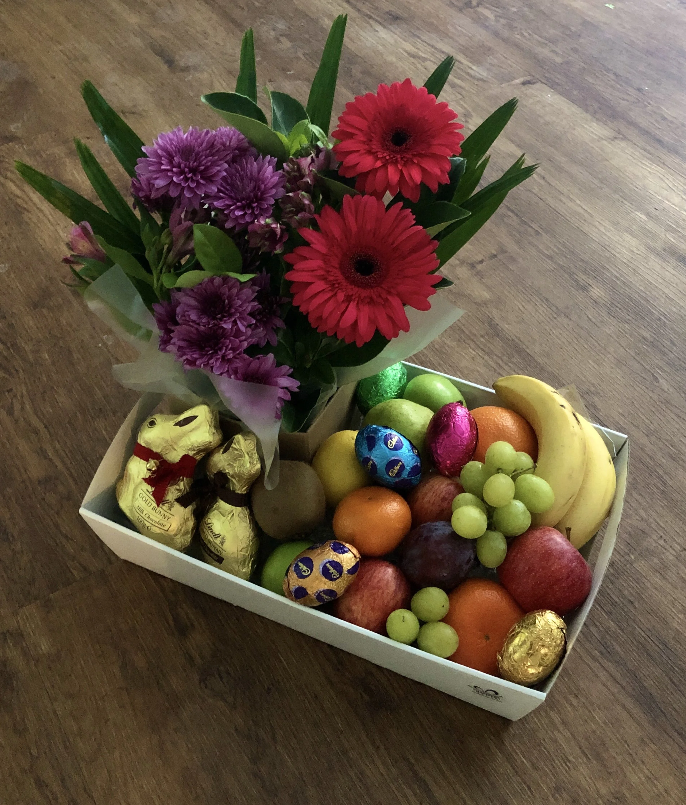 Bright and beautiful, this hamper is made up of seasonal fresh fruit, a boxed arrangement of flowers, 2 Lindt Lindor chocolate bunnies and a scattering of solid and hollow Cadbury Easter eggs